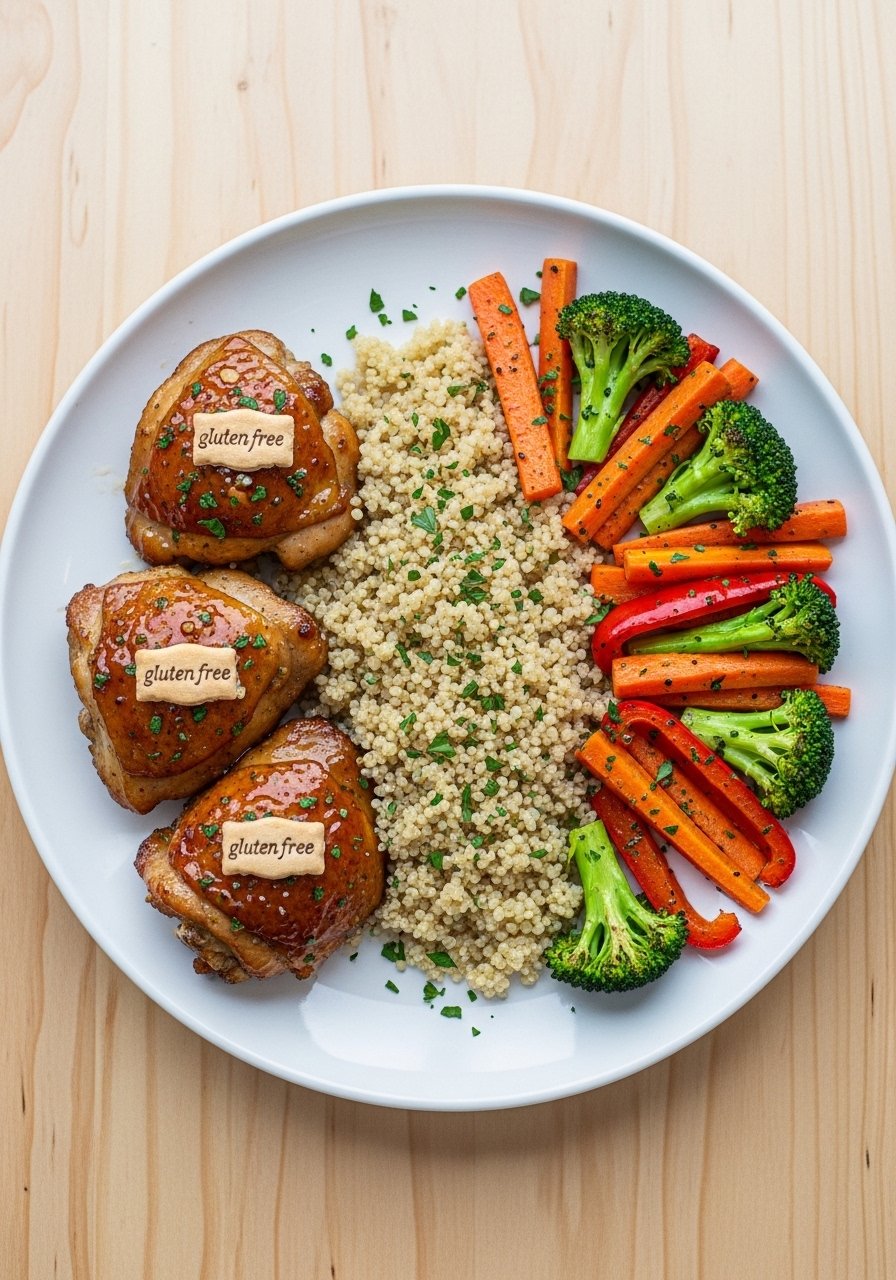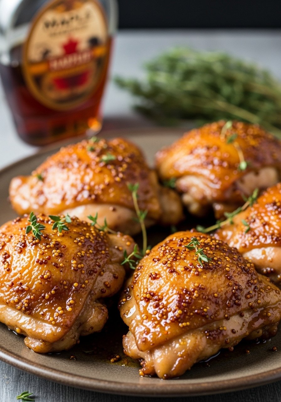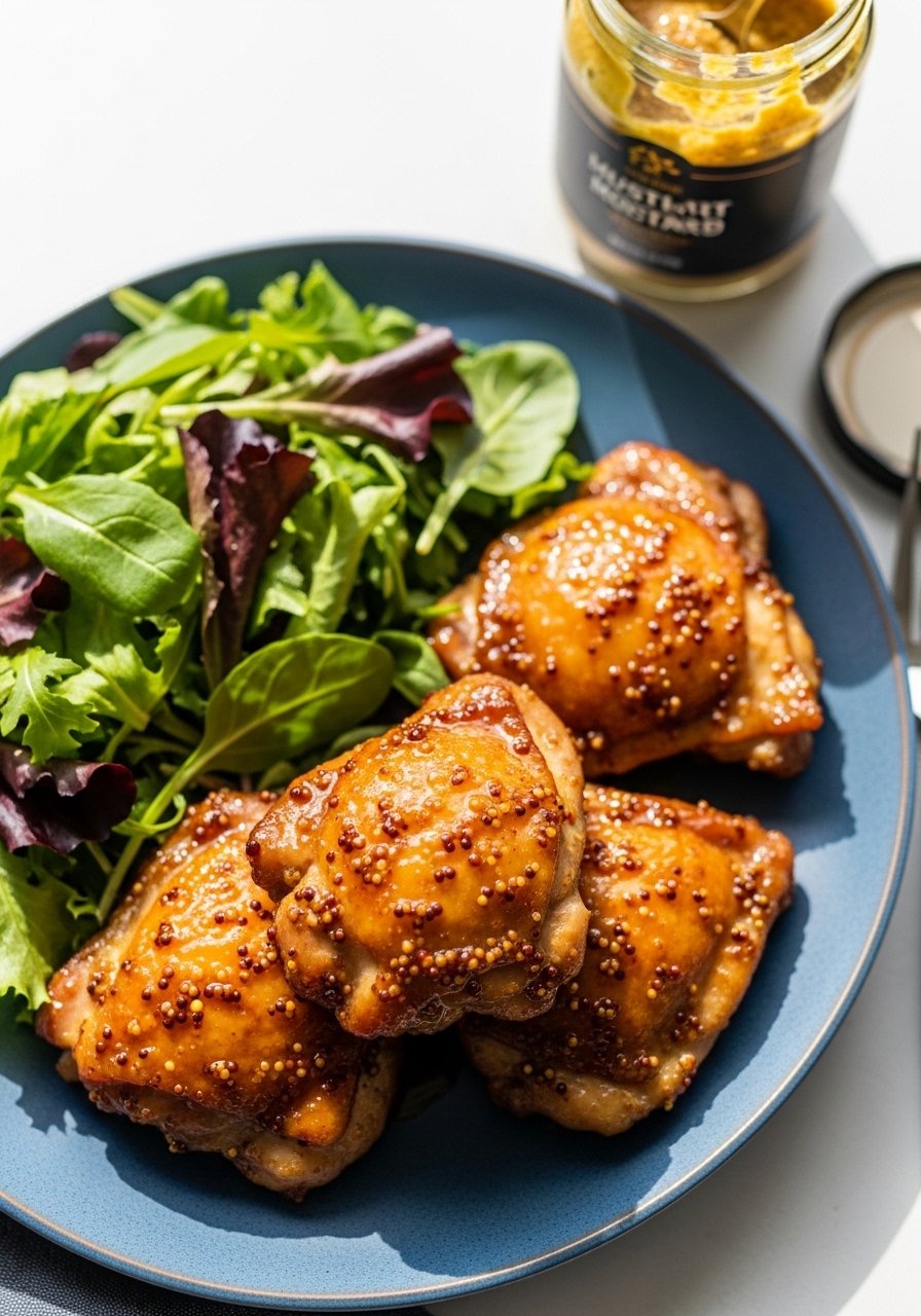 - Brush thighs and veggies with half the glaze. Roast 20–25 minutes until skin is golden and internal temp 165°F.