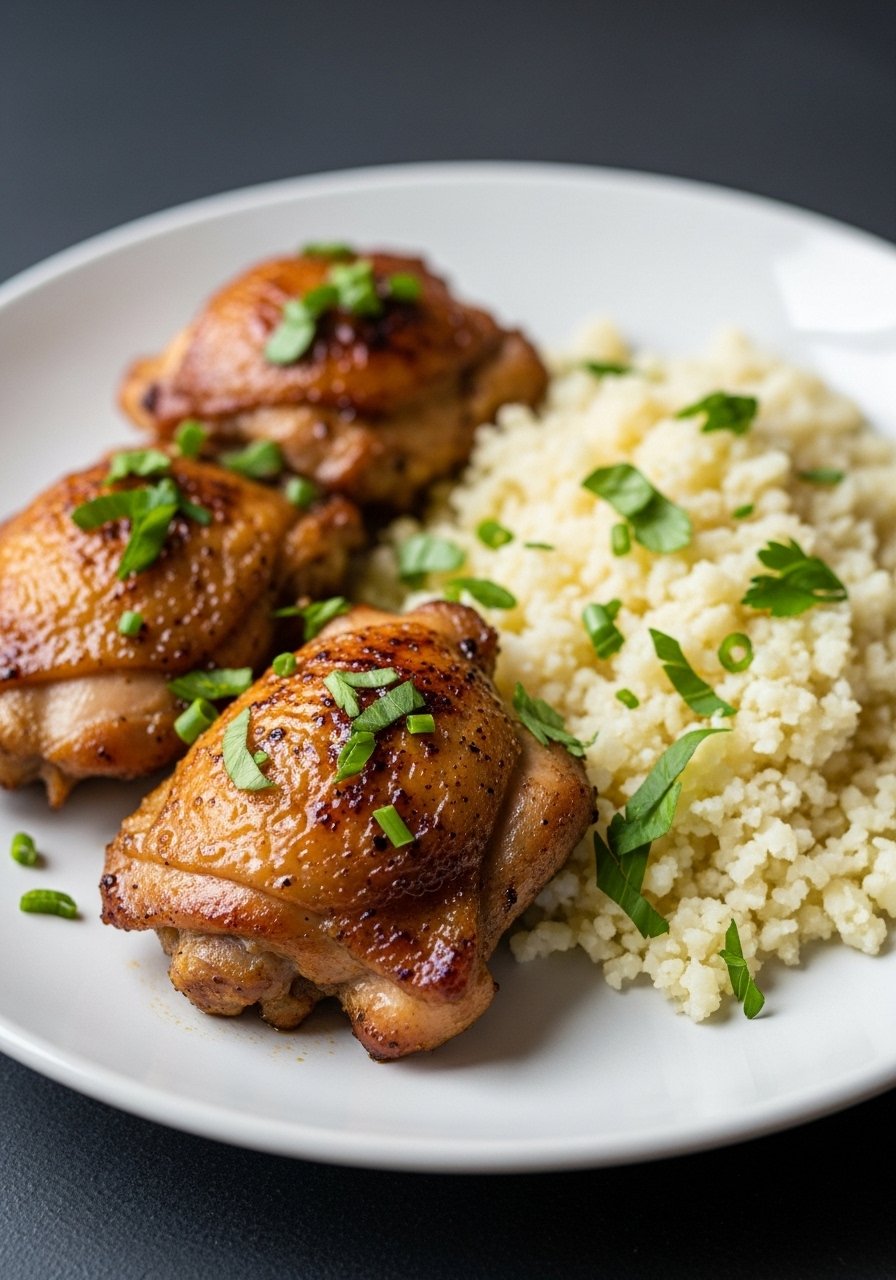 - Sear thighs in coconut oil 6–8 minutes skin-side down.