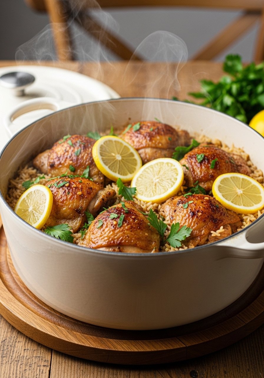 - Heat a Dutch oven over medium-high and sear thighs skin-side down 6–8 minutes.