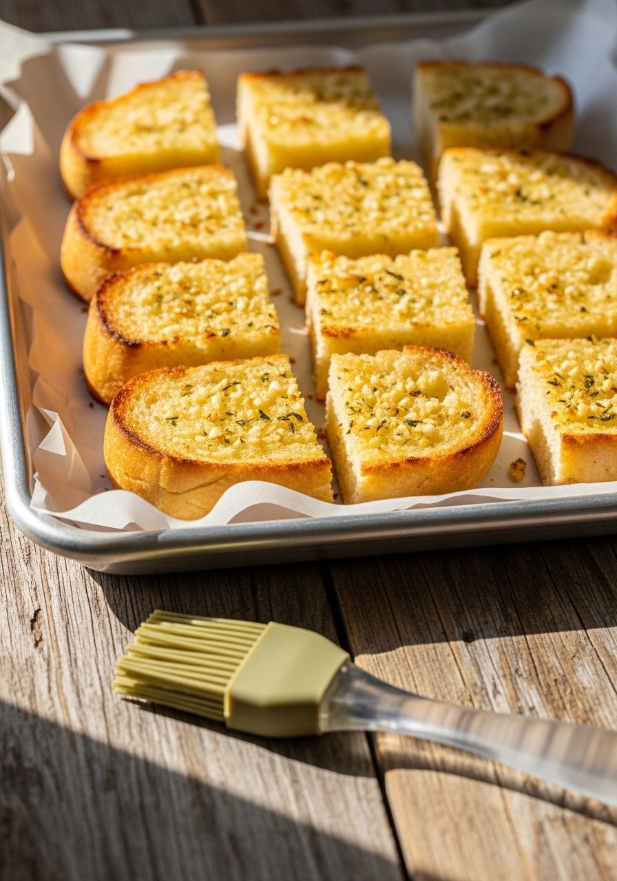 Start with slightly underbaked or fully baked garlic bread—either works. Slightly underbaked bread crisps up better when reheated. Spread butter-garlic mix evenly and let the bread cool to room temperature for about 30 minutes before freezing.