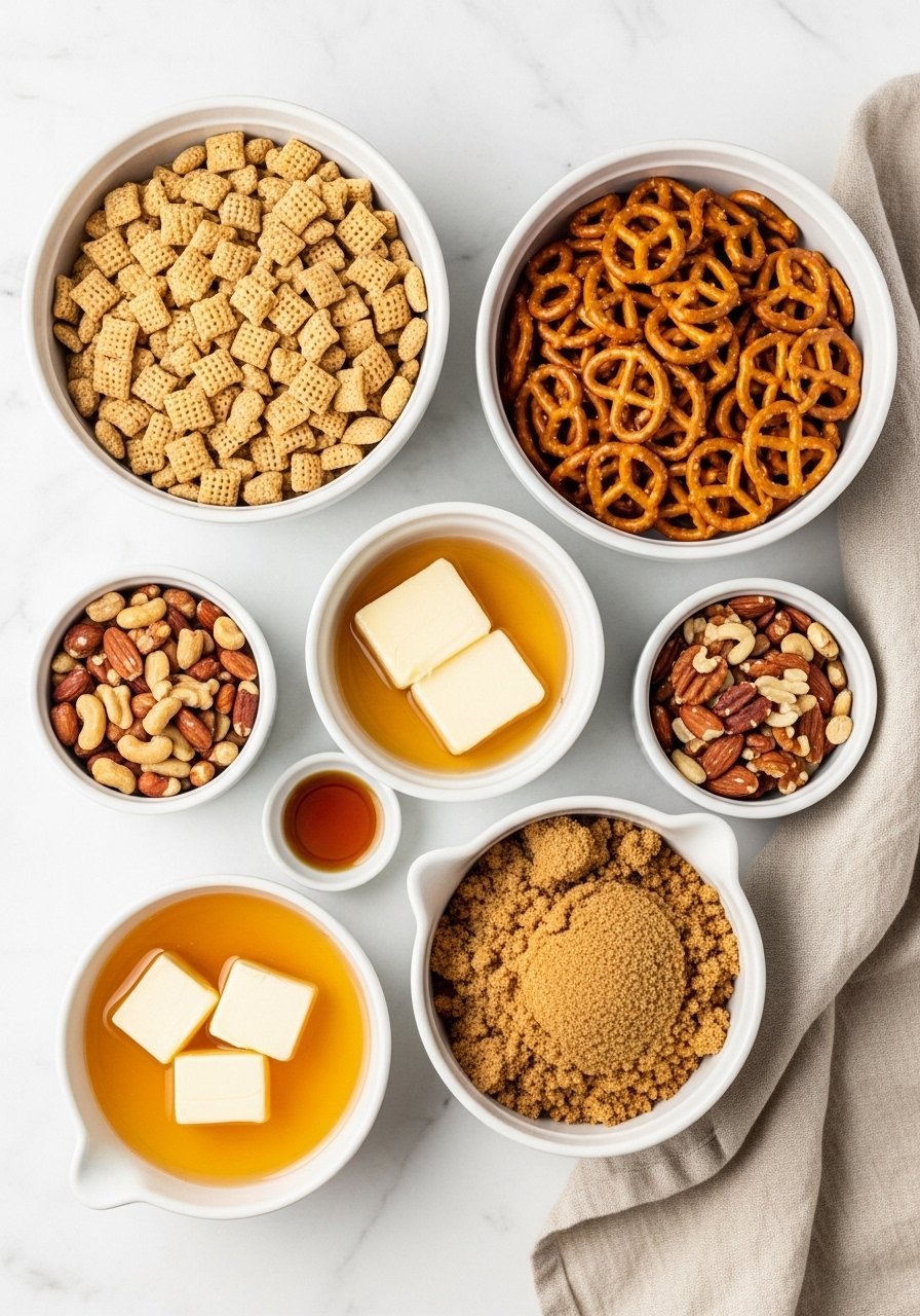 • Cereal and mix-ins: Use 6 cups rice Chex and 6 cups corn Chex, 1 cup pretzels, and 1 cup roasted peanuts or almonds.