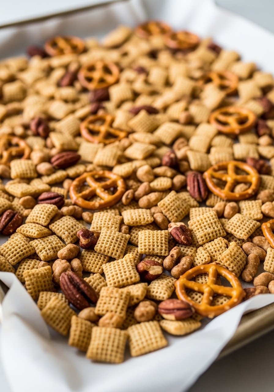 - Spread the hot Chex Mix on a rimmed baking sheet and bake at 250°F for 10–15 minutes on a rimmed baking sheet lined with parchment paper.