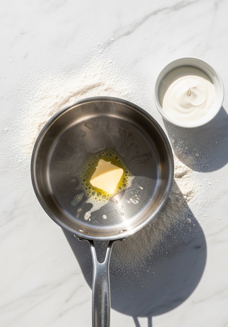 - In a heavy-bottomed saucepan, melt 2 tbsp butter, whisk in 1 tbsp flour to make a blond roux, cook 1–2 minutes.