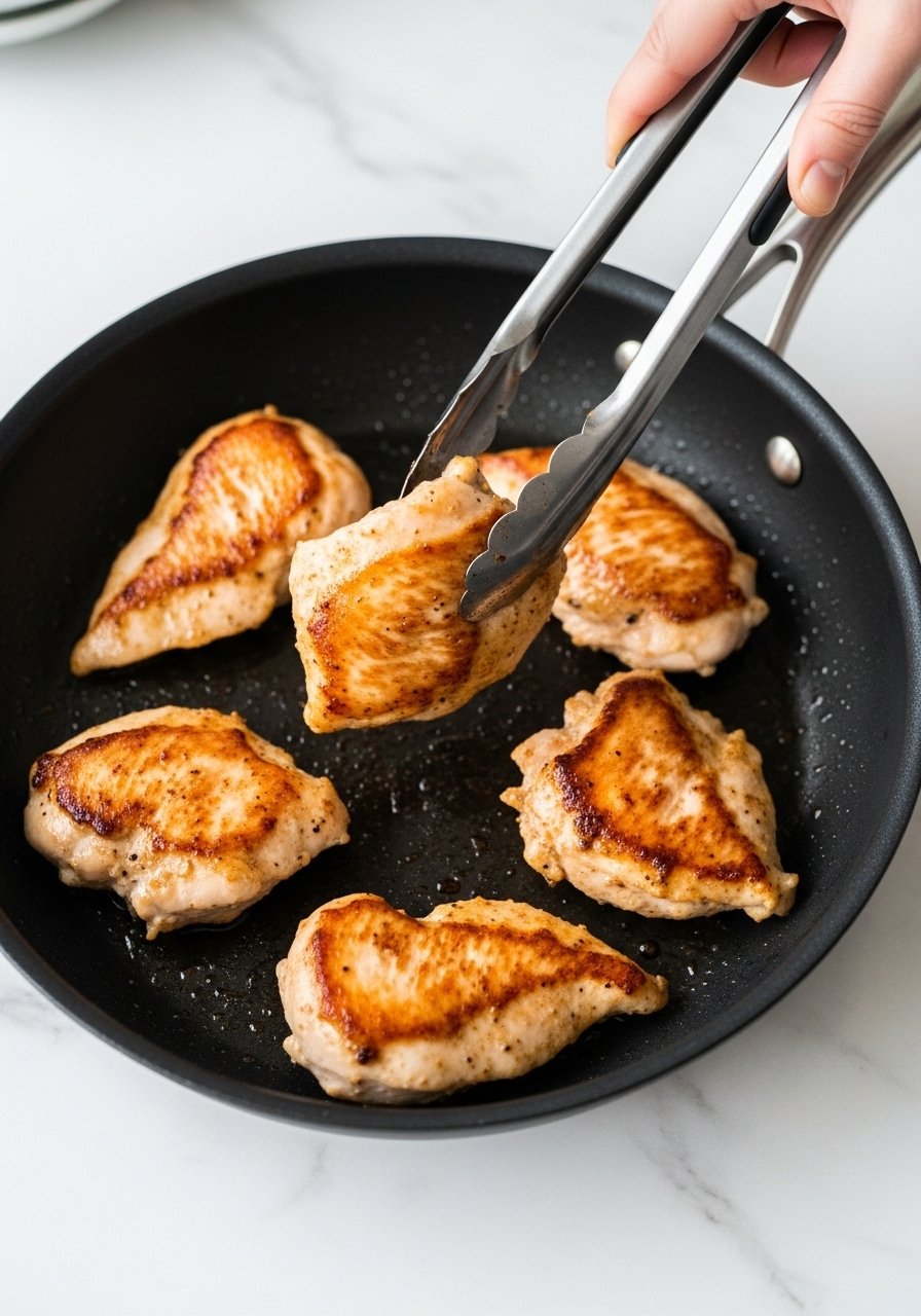 • Season chicken with salt and pepper; sear 3–4 minutes per side until golden. Finish in the pan and check internal temp with an instant-read thermometer. Pull at 165°F then rest 5 minutes.