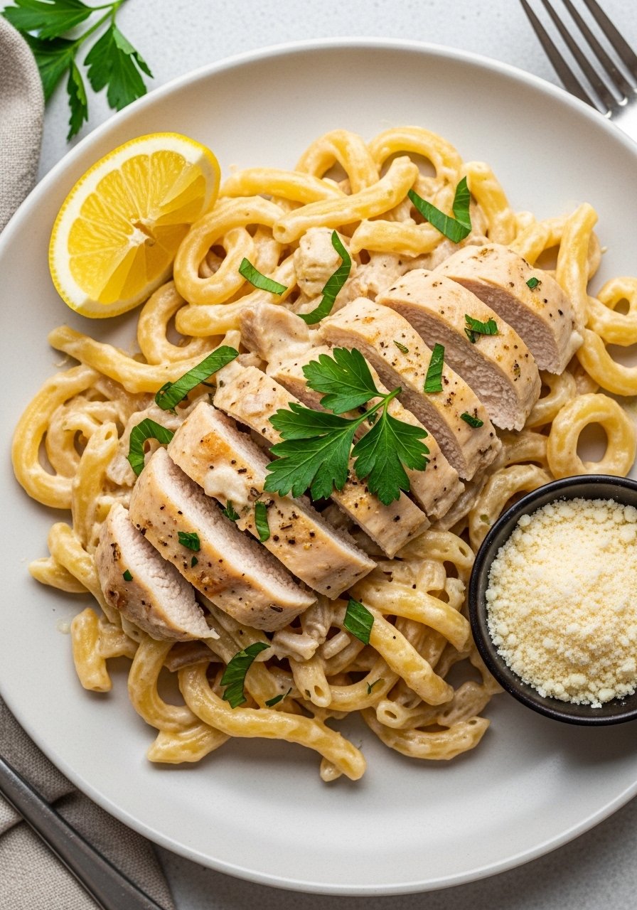 • Plate and top with sliced chicken, extra Parmesan, and chopped parsley.