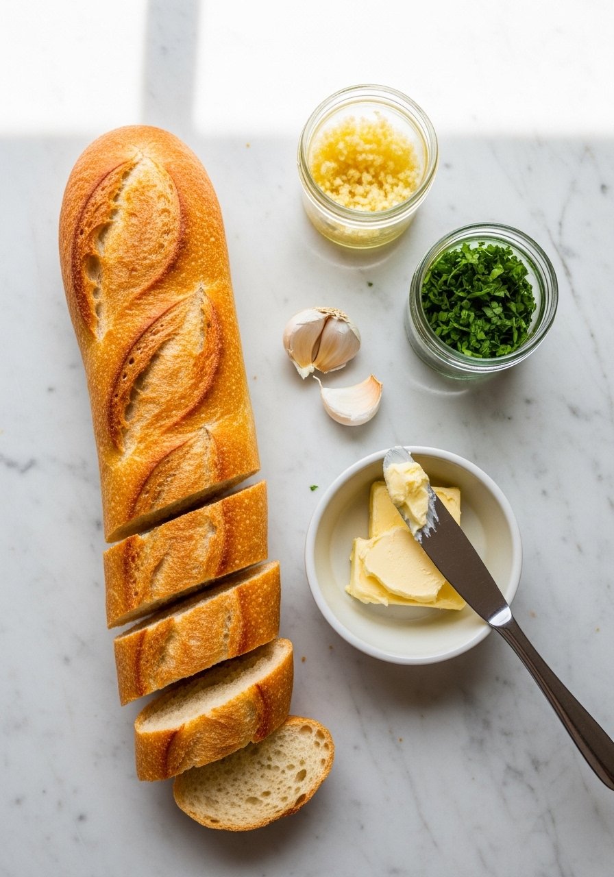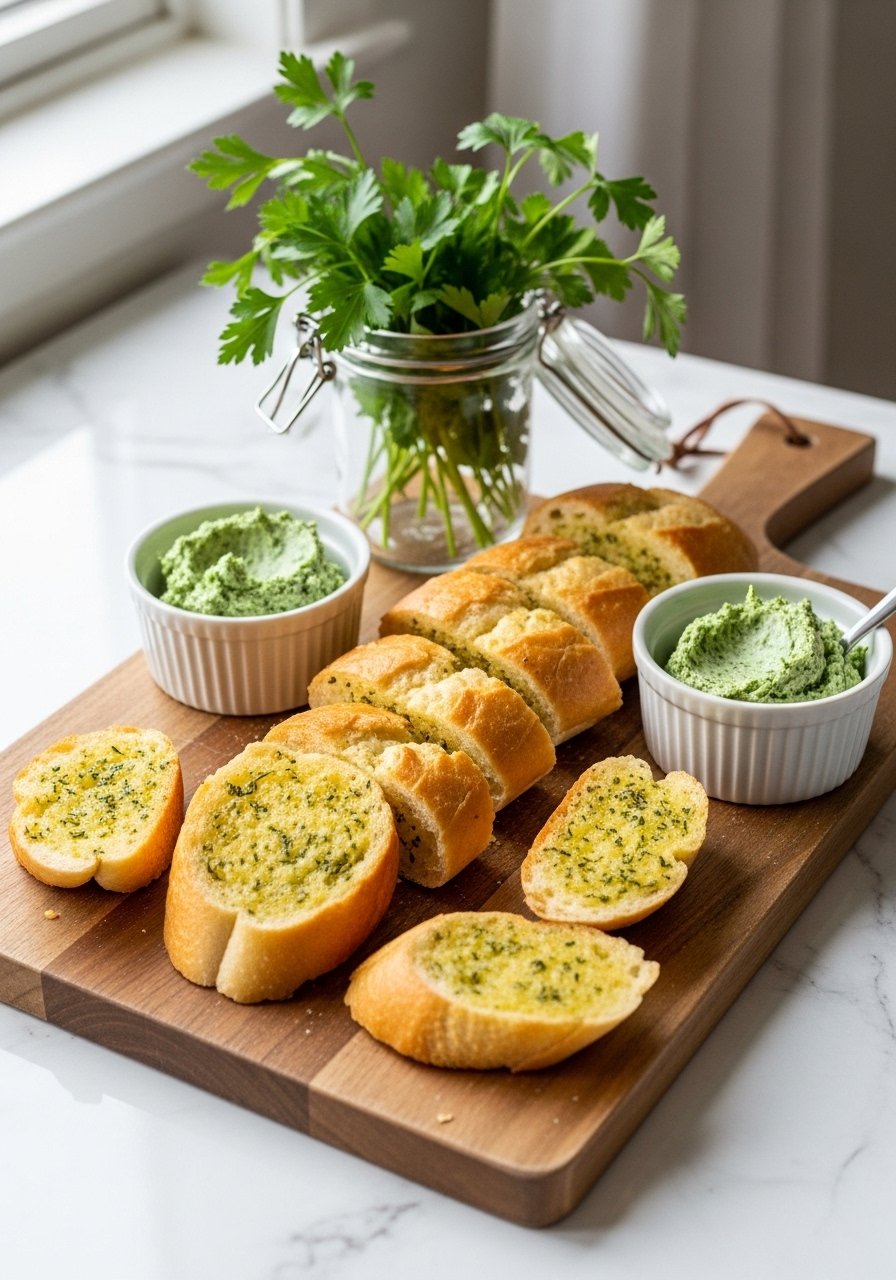 Start simple. For 4 servings, slice a baguette into 8–10 diagonal pieces, about 1-inch thick. Mix 4 tablespoons softened butter, 2 cloves minced garlic, 1 tablespoon chopped parsley, and a pinch of salt.