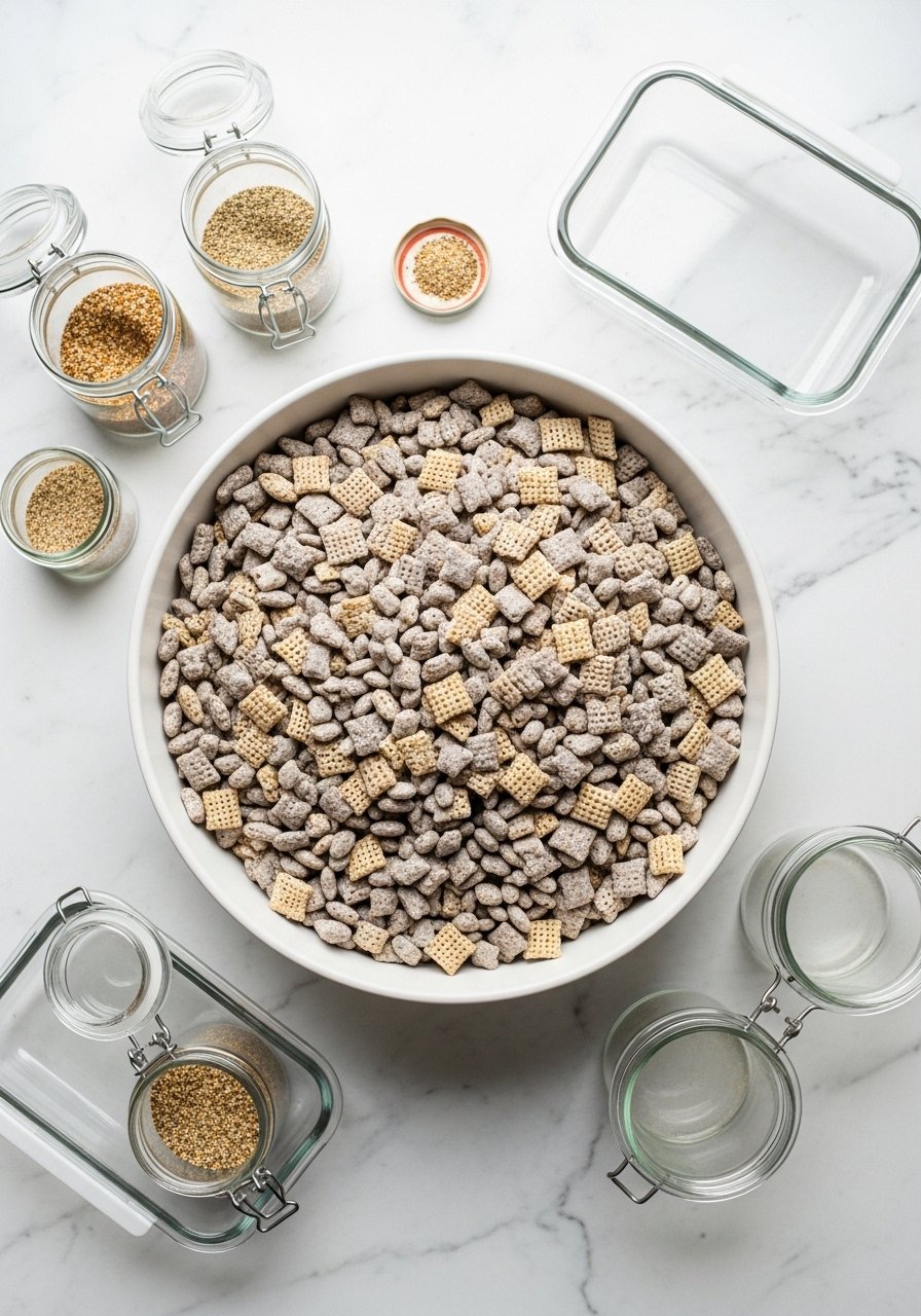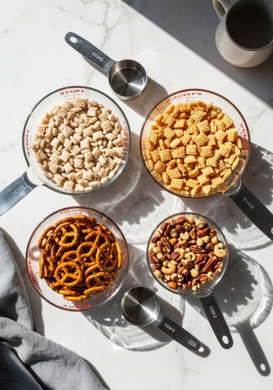 Measure precisely using a set of measuring cups and measuring spoons. Accurate ratios keep the cereal-to-coating balance right so your gluten free Chex mix stays crunchy, not soggy.