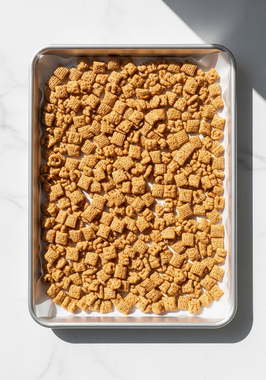 Pour the warm seasoning over the cereal mix in a large bowl. Toss with a silicone spatula until pieces are evenly coated. Work quickly so the cereal absorbs the flavor but doesn’t get soggy.
