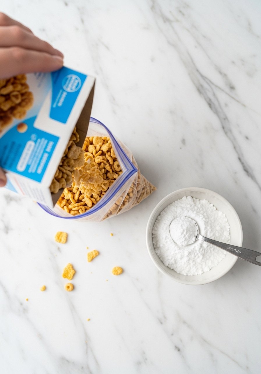- Transfer coated cereal into a zip-top freezer bag or a large paper bag.