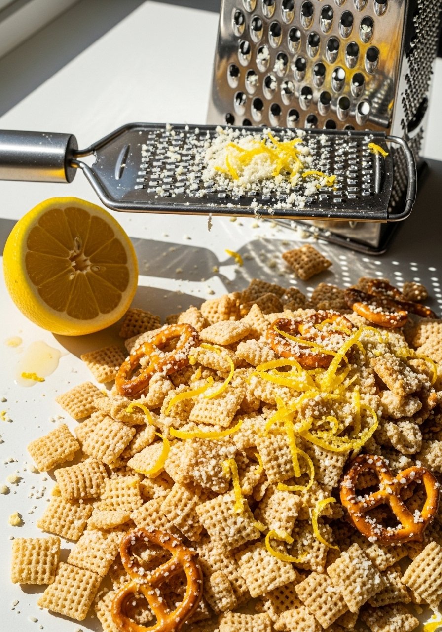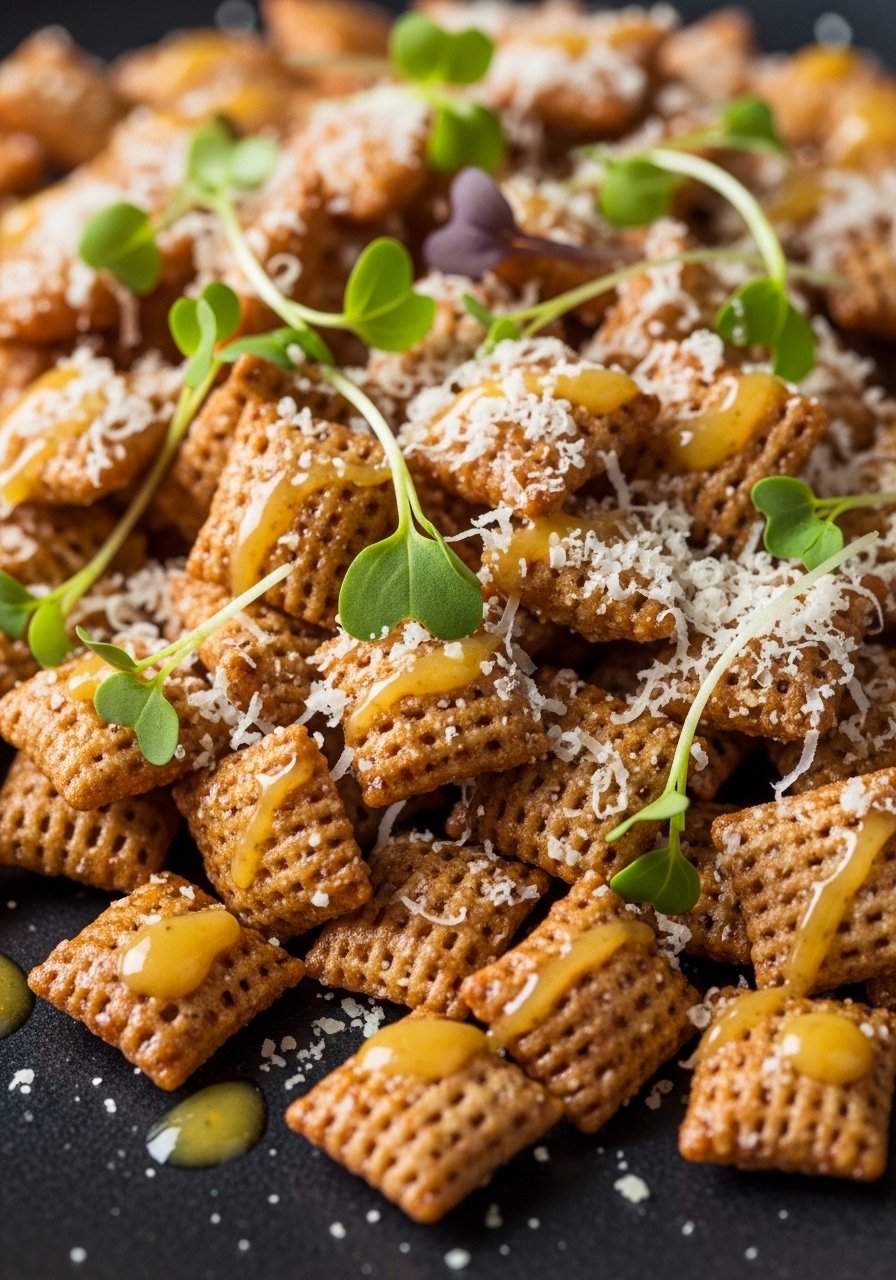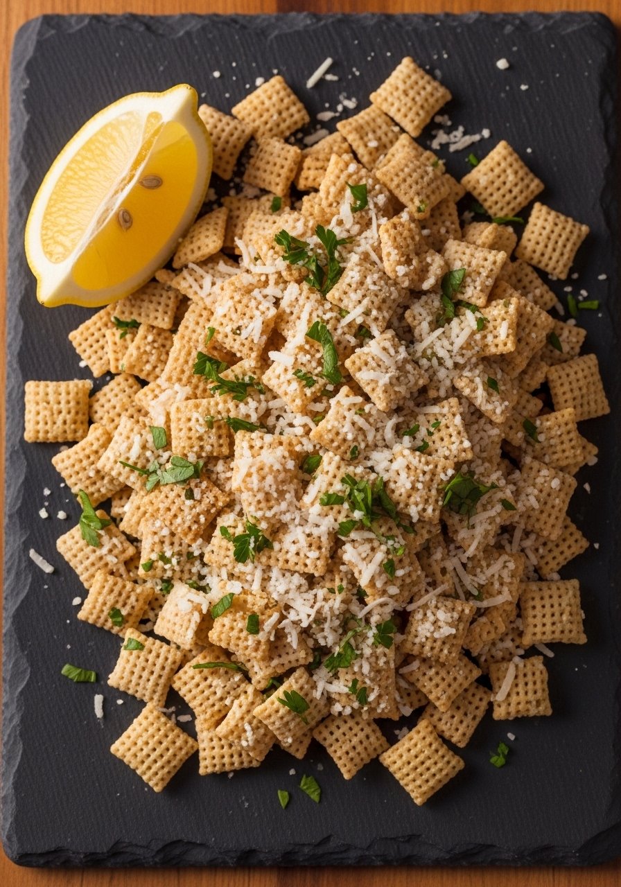 This savory chex mix recipe leans into bright garlic and nutty Parmesan for an upscale snack feel. The cheese adds savory depth while a squeeze of lemon brightens each bite. Great for book clubs or gifting in mason jars.