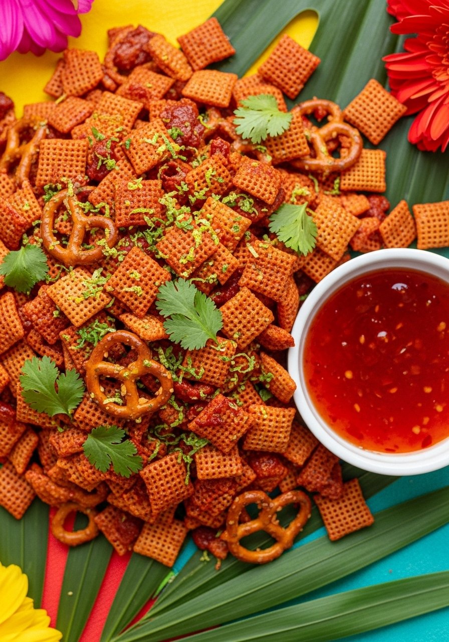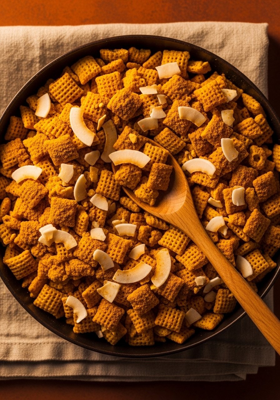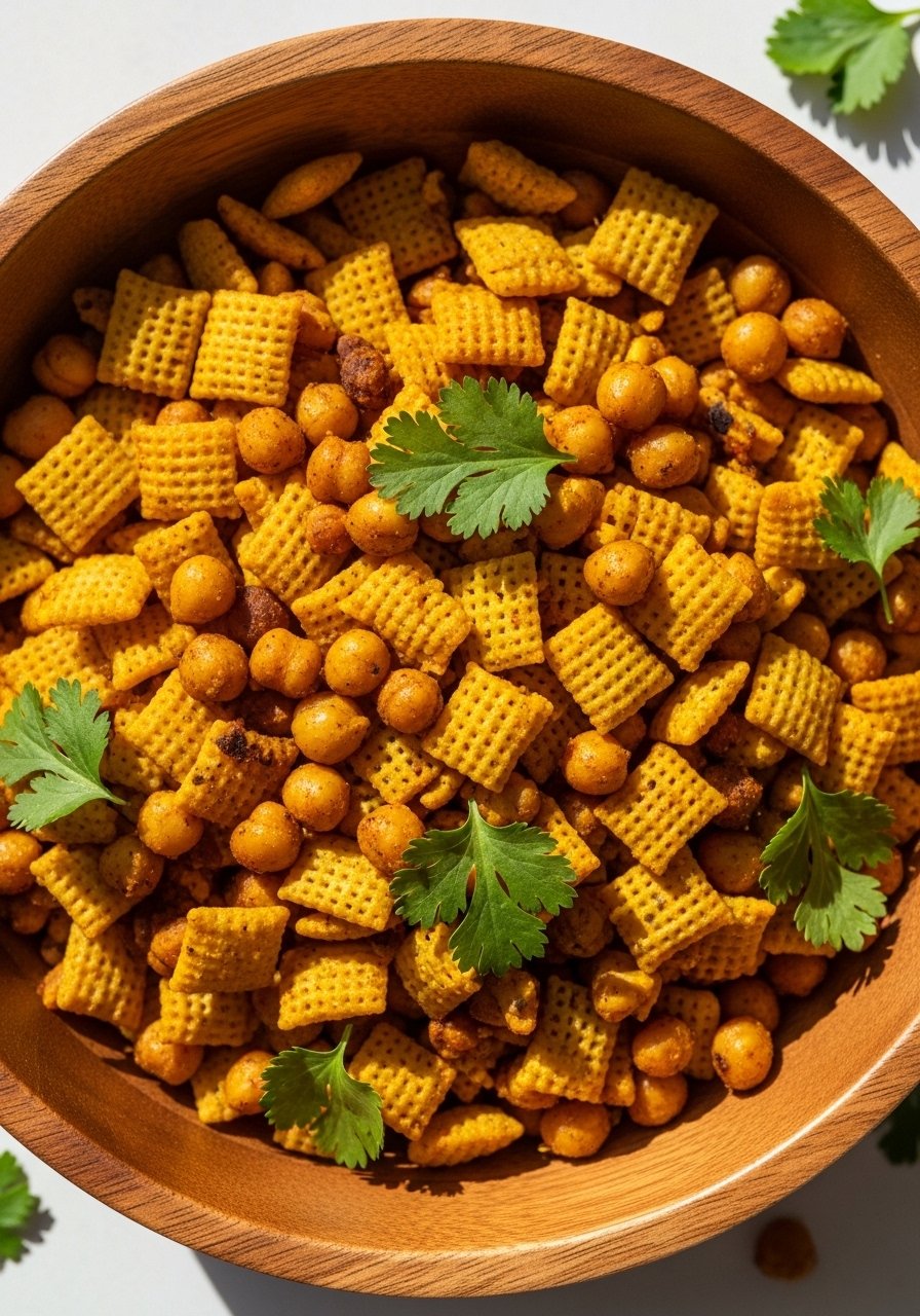 Adding roasted curried chickpeas gives protein and a satisfying crunch. This savory chex mix recipe is bold, fragrant, and hearty—great for hiking snacks or savory nibbling.