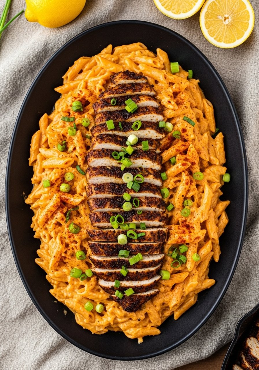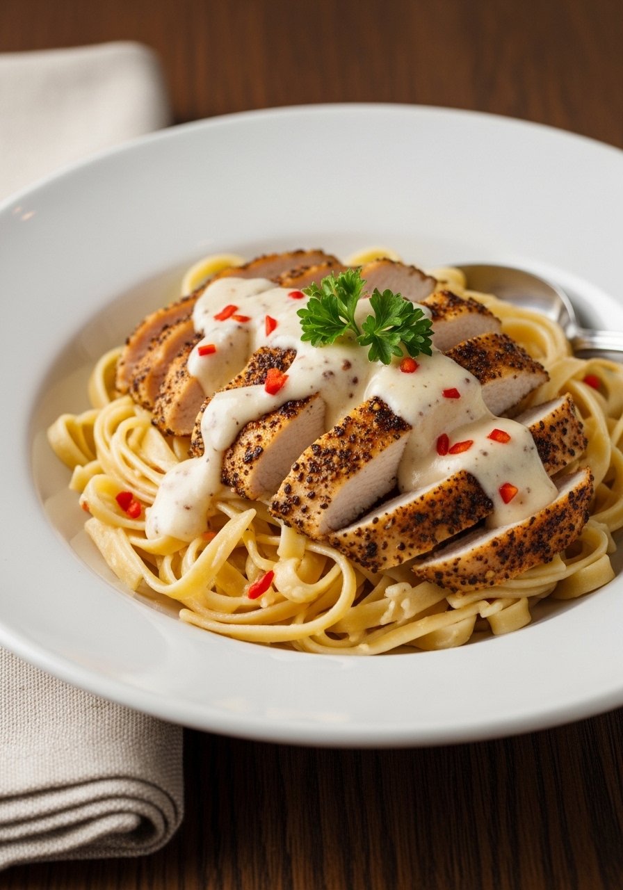 Bold, smoky, and just peppery enough—this Cajun twist brightens creamy Alfredo with blackened spices. The chicken's spicy crust contrasts the silky sauce for a satisfying textural play. Perfect for anyone who likes a Southern kick in their pasta.