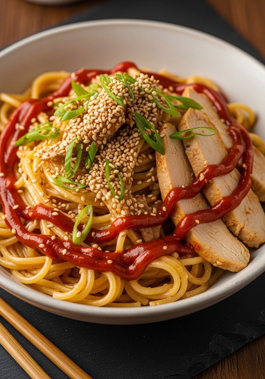 - Toss pasta with sauce, top with chicken, sesame seeds, and scallions.